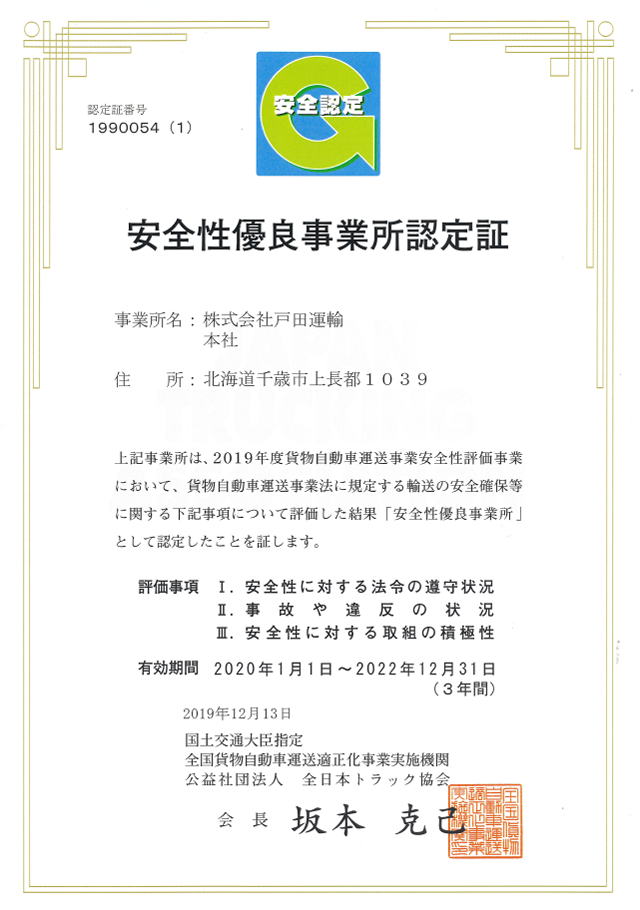 この制度は、トラック運送事業者の交通安全等に対する取り組みを「安全性に対する法令の遵守状況」「事故や違反の状況」「安全性に対する取組の積極性」の3項目で評価し、事業所ごとに認定を行うもので、それによってお客様がより安全性の高いトラック運送事業者を選びやすくするとともに、事業者全体の安全性向上に対する意識を高めるため、全国貨物自動車運送適正化事業実施機関が事業者の安全性を正当に評価・認定・公表する制度です。